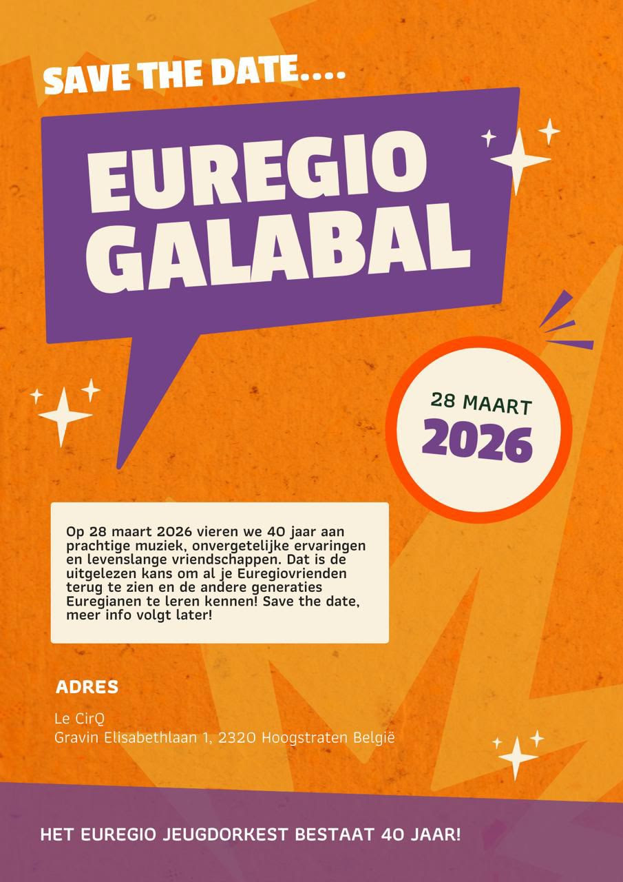 Op 28 maart 2026 vieren we 40 jaar aan prachtige muziek, onvergetelijke ervaringen en levenslange vriendschappen. Dat is de uitgelezen kans om al je Euregiovrienden terug te zien en de andere generaties Euregianen te leren kennen! Klik op de poster voor de volledige afbeelding.